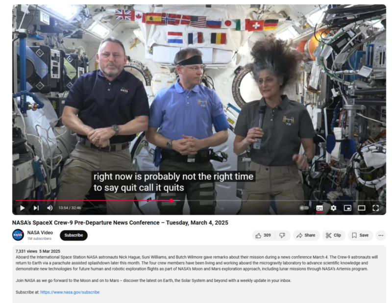 该视频发布于2025年3月5日,显示威廉姆斯、威尔莫尔在国际空间站,与NASA商业乘员计划Crew-9任务成员尼克·黑格(Nick Hague)一同接受连线采访。