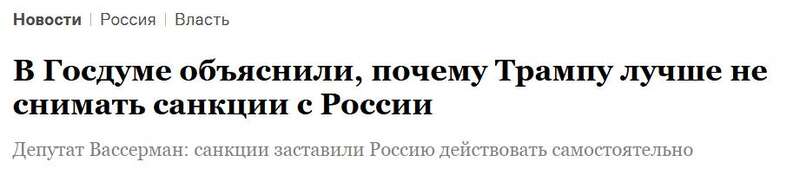 背靠中国这棵大树顶住了西方的全面制裁后,一些俄罗斯精英,也产生了越打越强的幻觉。俄罗斯国家杜马议员阿纳托利·瓦瑟曼不久前向俄媒“新闻网”(NEWS.ru)表示,特朗普解除对俄罗斯的制裁,不会让俄罗斯受益。实际上,由于美国的制裁。俄罗斯获得了“更大的独立性”。